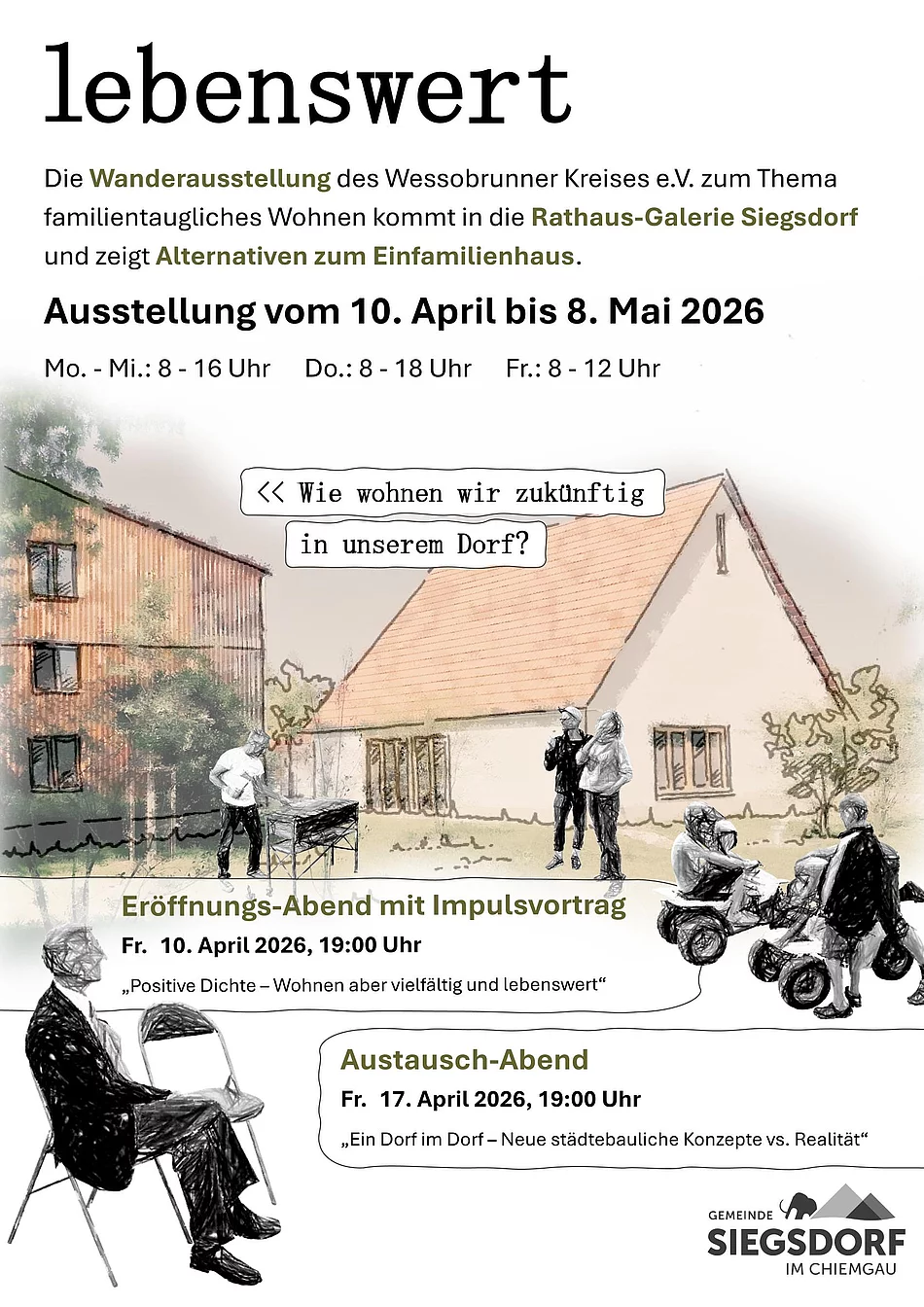 Ein weiteres Highlight während des Ausstellungszeitraumes wird der Austausch-Abend mit Fachvortrag „Ein Dorf im Dorf – Neue städtebauliche Konzepte vs. Realität“ von Herrn Dr. Raab (Stadtplaner (BayAK) und Büroinhaber von RAAB Planung, München) am Freitag, den 17.04.2026 um 19:00 Uhr sein. Er berichtet aus 25 Jahren Erfahrung in der Tätigkeit als Stadtplaner mit der Umsetzung von städtebaulichen Konzepten für „neue“ Wohnformen und was wir daraus lernen können.