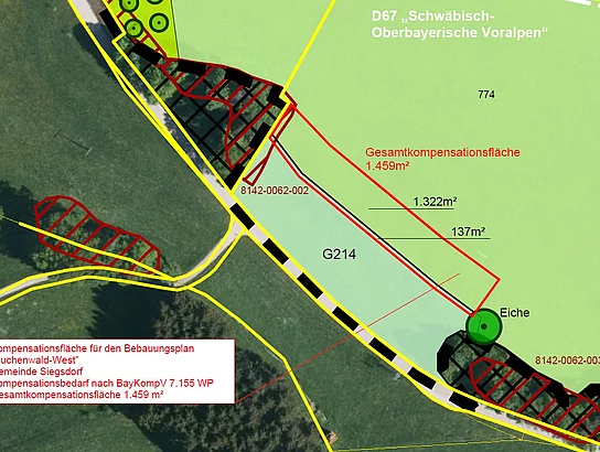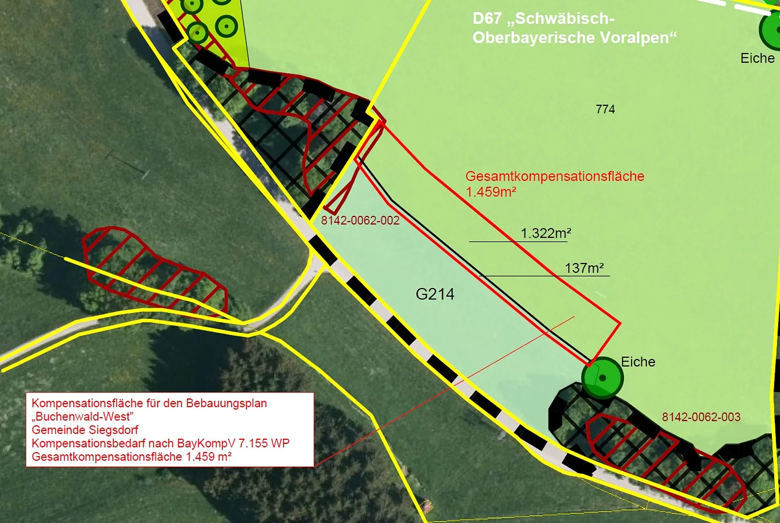 Ein Teil der Ausgleichsflächen zum Bebauungsplan „Buchenwald-West“ liegt im Geltungsbereich des Bebauungsplans im westlichen Teil der Fl. Nr. 130/0 (0,186 ha). Die restliche Fläche liegt im Gemeindegebiet Siegsdorf Fl. Nr. 774 Gemarkung Vogling. (1.459m2). Diese Fläche befindet sich in Obereck und ist Teil eines Ökokontos.